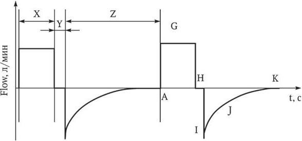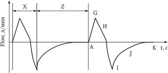 Х – время вдоха; Y – пауза на вдохе; Z – время выдоха; А – начало вдоха; G – пиковый поток на вдохе; H – нулевой поток паузы вдоха; I – пиковый поток на выдохе; J – снижение потока на выдохе; K – конец выдоха, нулевой поток