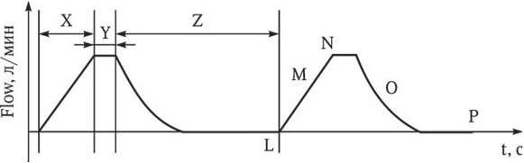 Х – время вдоха; Y – пауза на вдохе; Z – время выдоха; L – начало вдоха; M – увеличение дыхательного объема на вдохе; N – конец вдоха, максимальный дыхательный объем; O – снижение дыхательного объема на выдохе; P – конец выдоха, нулевой дыхательный объем