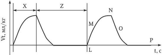 Х – время вдоха; Z – время выдоха; L – начало вдоха; M – увеличение дыхательного объема на вдохе; N – конец вдоха, максимальный дыхательный объем; O – снижение дыхательного объема на выдохе; P – конец выдоха, нулевой дыхательный объем
