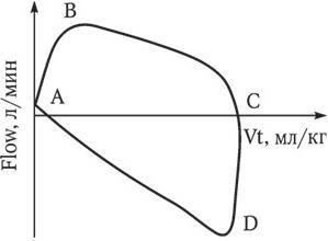 А – начало вдоха/конец выдоха; В – пиковый поток на вдохе; С – конец вдоха/начало выдоха; D – пиковый поток на выдохе