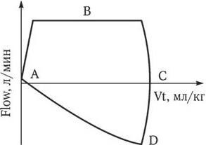 Рис. 10. Петля Flow/Vt в режиме PCV (PC, PRVC, SIMV (PC)): А – начало вдоха/конец выдоха; В – пиковый поток на вдохе; С – конец вдоха/ло выдоха; D – пиковый поток на выдохе