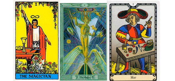Перед вами три варианты одной и той же карты, Аркана Маг, из трех разных колод.