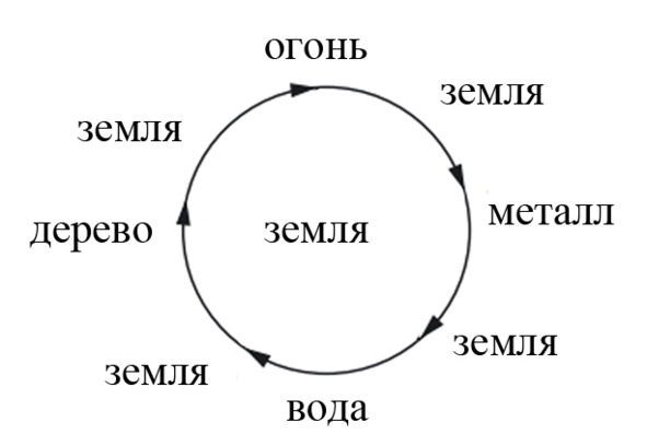 Дерево порождает Огонь, Огонь порождает Землю, Земля – Металл, Металл – Воду, Вода – снова Дерево.