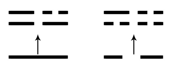 В гексаграмме подвижность линий обозначают дополнительными крестом и кругом на линиях, но эту идею можно отобразить иначе – через удвоение линий. Так из Ян и Инь мы получим четыре символа, которые приведены ниже (рис. 7). Просто над Ян нарисуйте Ян и Инь, и над Инь нарисуйте Ян и Инь. И это уже начало строительства будущей гексаграммы.