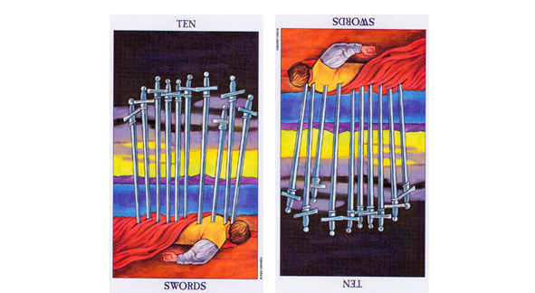 Но вот одна из самых неприятных карт – 10 мечей. Катастрофа. В колоде Уайта рисунок довольно красноречив. Человека закололи в спину 10 мечами. Он умер, у него все плохо. Перевернем карту и что? Ему полегчало? Или карта Катастрофа стала картой Еще Более Катастрофическая Катастрофа? Или стала вдруг благой и приятной?