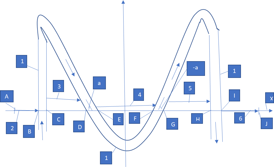 Пусть луч света распространяется вдоль оси × между точками А и J (рис. 1). На пути он встречает поток эфира 1 одинаковой ширины на всём своём протяжении, текущий с постоянной скоростью v вдоль указанного стрелками направления. Этот поток пересекает луч света на четырёх участках. На участке ВС поток 1 перпендикулярен лучу и увлекает его вверх, на участке HI поток 1 перпендикулярен лучу и увлекает его вниз, на участке DE поток пересекает луч под углом а, на участке FG поток пересекает луч под углом – а. То есть участки DE и FG симметричны относительно вертикальной прямой у, расположенной посередине между ними. Участки 3, 4, 5, символизирующие горизонтальную составляющую пути луча, сдвинуты относительно оси × вверх на величину, пропорциональную вертикальной составляющей скорости потока 1. Попробуем посчитать среднюю скорость распространения луча на участке AJ, точнее её горизонтальную составляющую. На участках 2, 3, 4, 5, 6 эфир неподвижен и скорость света равна стандартной скорости света с, на участке ВС изменяется вертикальная составляющая скорости, горизонтальная составляющая продолжает оставаться с. На участке DE скорость света vDE больше с и равна