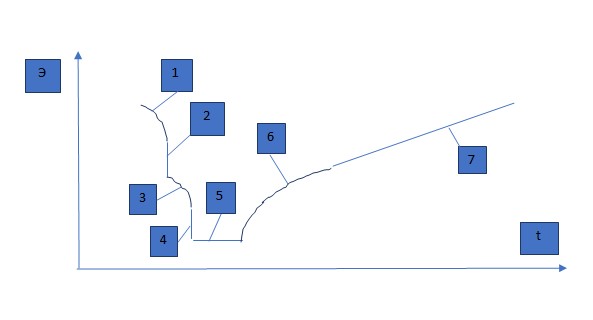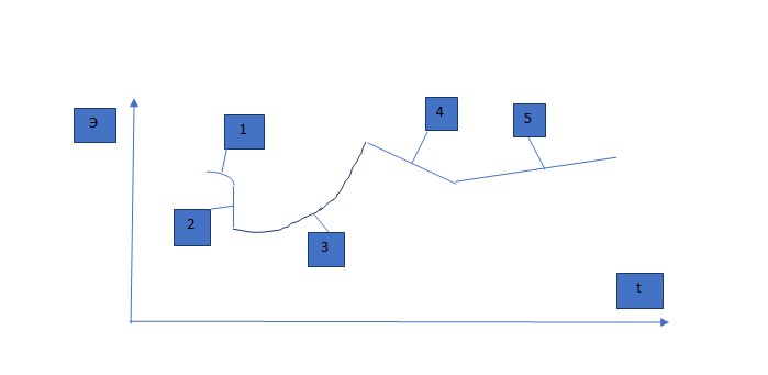 Рис. 5 Изменения со временем t общей энтропии нашего уровня организации Э в цикле на рис. 2