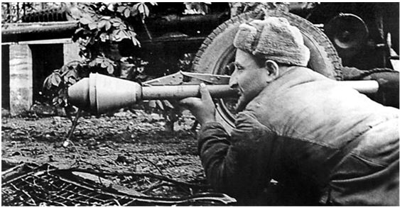 Советский солдат с фаустпатроном. Гранатометы часто становились трофеем Красной Армии и широко использовались в войсках.