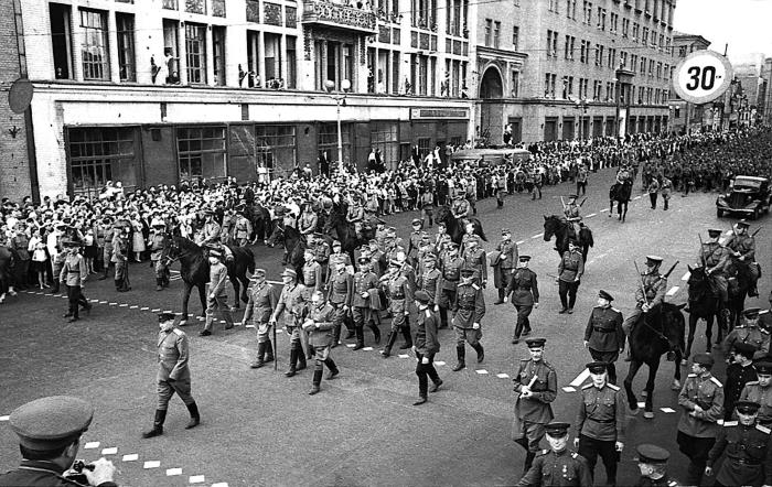 Колонна немецких военнопленных во время «марша побежденных» в Москве 17 июля 1944 г. Впереди компактной группой шагают 19 генералов