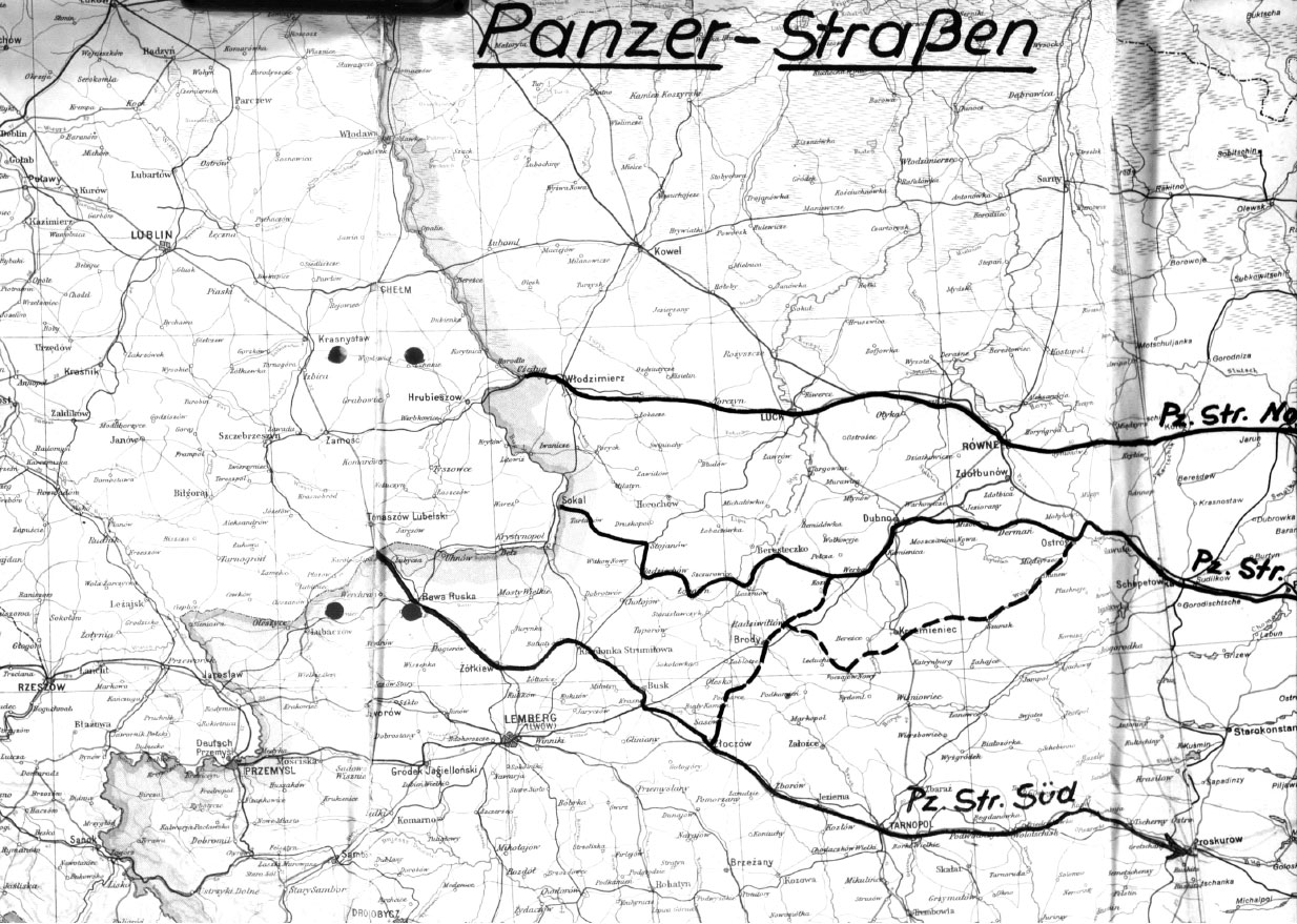 Одним из краеугольных камней германского военного планирования была концепция выбора и точного определения так называемых «панцерштрассе» (Panzerschtrasse – букв. «танковая дорога»). Иногда в документах ее также называли Rollbahn (автогужевое шоссе, рулежная дорожка в авиации). В «Директивах по вождению танковой дивизии» 1940 г. указывалось: «Предельное использование скорости дивизии обеспечивается предоставлением ей хороших дорог с мостами большой грузоподъемности и освобождением этих дорог от других частей».[5] Соответственно, концепция «панцерштрассе» предусматривала заблаговременное выявление в полосе предстоящего наступления дорог, которые могли бы стать осью продвижения механизированных соединений. Танки и БТР, разумеется, могли действовать вне дорог. Однако многочисленный автотранспорт, тысячи автомашин, обеспечивавших снабжение танковых частей, требовали хороших дорог с твердым покрытием.
