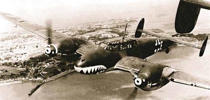 Немецкий тяжелый истребитель «Мессершмитт Bf.110» из 6./ZG 76 (раскраска «акулья пасть») в небе над Ла-Маншем во время Битвы за Британию. Август 1940 г.