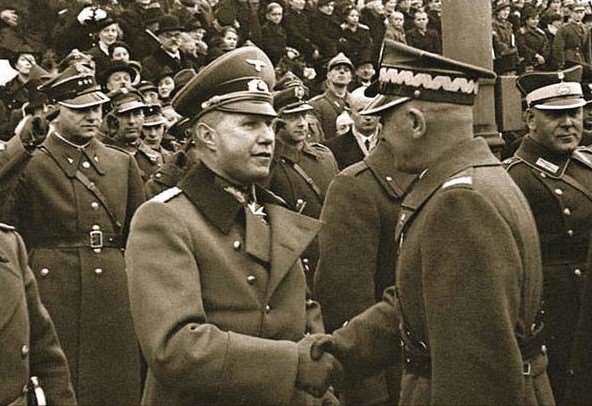 Рукопожатие польского маршала Эдварда Рыдз-Смиглы и немецкого военного атташе генерал-майора Богислава фон Штудница на параде «Дня независимости» в Варшаве 11 ноября 1938 г. Парад особо привязывался к захвату Войском Польским месяцем ранее чешской Тешинской Силезии