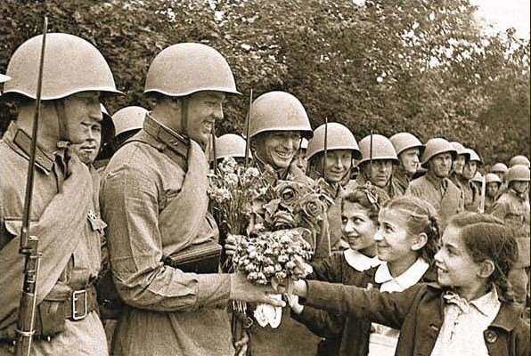 Дети дарят цветы бойцам Красной Армии во время парада в Кишиневе по случаю вхождения Бессарабии в состав СССР. Июль 1940 г.