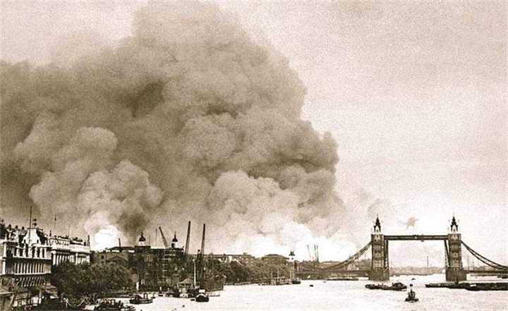 Панорама пожара в портовой части Лондона после первого массированного налета бомбардировщиков Люфтваффе. 7 сентября 1940 г. На заднем плане – знаменитый Тауэрский мост, один из символов Великобритании