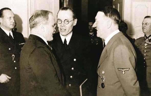Советский нарком иностранных дел В.М. Молотов на приеме у Адольфа Гитлера в рейхсканцелярии. 13 ноября 1940 года. В качестве переводчика выступает немецкий дипломат Густав Хильгер. На заднем плане – немецкий дипломат Вальтер Хевель (слева) и начальник штаба Верховного главнокомандования Вермахта генерал-фельдмаршал Вильгельм Кейтель (справа)