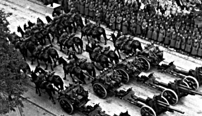 Батарея 105-мм легких полевых гаубиц «leFH18» на гужевой тяге.