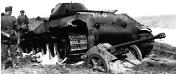 Танк Т-34, подбитый сразу после того, как раздавил немецкую 50-мм противотанковую пушку ПАК-38