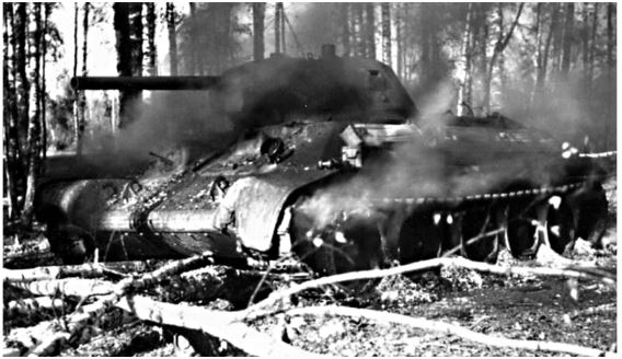 Подбитый и сгоревший в лесу танк Т-34. Лето 1941 г.