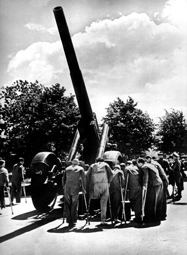 Одно из самых страшных фото войны. Раненые солдаты на экскурсии по выставке трофеев в Москве рядом с немецкой 210-мм гаубицей – тяжелым орудием полевой артиллерии вермахта. Эти орудия, несмотря на немногочисленность, играли важную роль в системе обороны немецких войск