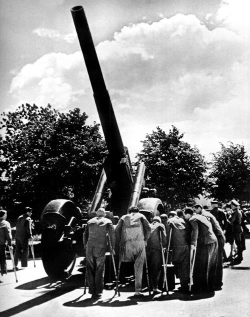 Одно из самых страшных фото войны. Раненые солдаты на экскурсии по выставке трофеев в Москве рядом с немецкой 210-мм гаубицей – тяжелым орудием полевой артиллерии вермахта. Эти орудия, несмотря на немногочисленность, играли важную роль в системе обороны немецких войск
