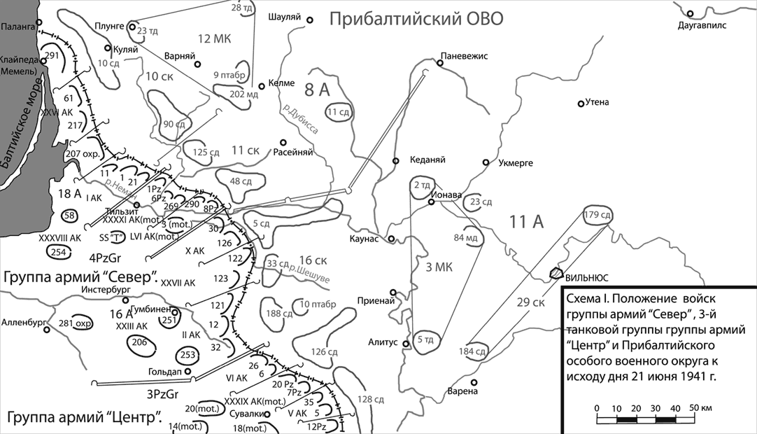 21 июня командиры полков вместе с небольшими группами офицеров штаба и командирами батальонов занимались рекогносцировкой. В тот же день с оперативной группой офицеров выехал ближе к границе и командир дивизии. Основные силы дивизии по-прежнему оставались в лагерях. Туда же после рекогносцировки поздно вечером вернулись и все офицеры частей, командиры полков остались ночевать на границе… Почти на 40-километровом фронте от Кибартай и южнее до оз. Вишптиспис по-прежнему оставалась лишь тонкая цепочка трех батальонов».