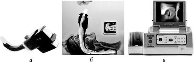 Рис. 1.6. Общий вид ларингоскопа Airtraq (а); ларингоскоп подведен к входу голосовой щели и эндотрахеальная трубка введена в трахею под контролем глаза (б); видеосистема (в)