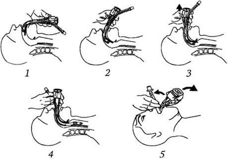 Порядок работы с Airtraq. Выберите размер Airtraq на основании размера ЭТТ, включите лампочку, нажав выключатель на левой стороне окуляра (лампочка перестает мигать через 30 – 60 с, если включена функция защиты от запотевания), смажьте ЭТТ и установите в боковой канал Airtraq, сопоставьте кончик ЭТТ с концом бокового канала, смажьте Airtraq, не касаясь оптической части. После этого выполните следующие 5 этапов интубации трахеи (рис. 1.7). В 2008 г. Airtraq успешно применялся в ряде ЛПУ МЗ и МО РФ (в том числе в 3-м ЦКВГ им. А. А. Вишневского и в ГВКГ им. Н. Н. Бурденко), получив положительный отзыв *.