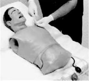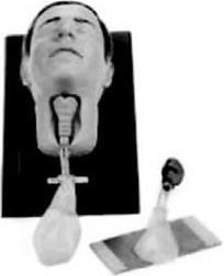 Имитатор крикотиреотомии. Навыки крикотиреотомии иглой и хирургически можно практиковать на этой модели, которая относится к серии манекенов взрослых (исключая «Tuff Kelly»). Эта модель имеет натуральную величину головы для крикотиреотомии, анатомически точные ориентиры, имитацию легких, крикотиреотомию иглой и хирургически, одну ригидную и одну мягкую трахею, а также заменяемую кожу шеи с памятью самовосстановления. Модуль смонтирован на подставке и поставляется с одной ригидной и одной мягкой взаимозаменяемой трахеей, баллоном легких, поддерживающим стержнем, кожей шеи и подставкой (рис. 1.12).