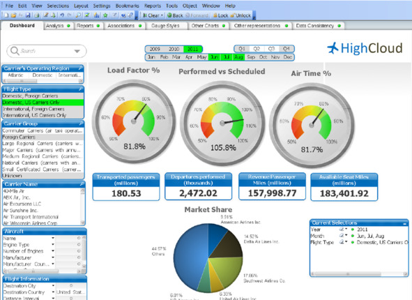 Объем данных увеличивался, и программы для автоматизации отчетов, обработки больших объемов данных стали еще нужнее. Этот класс программного обеспечения стал называться BI (Business Intelligence), а в русской адаптации – системы бизнес-аналитики. Появилось много программ, которые позволяли создавать дашборды, красивые и не очень. Вот, например, как выглядел дашборд в начале 2010-х, созданный в системе Qlikview, находившейся в то время на пике популярности.