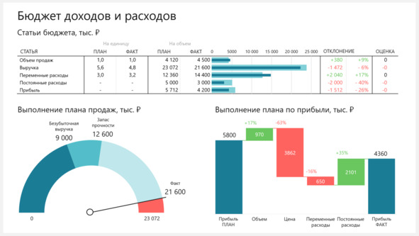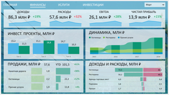 В современных дашбордах можно увидеть сходство с «предками», только они стали технологичнее и удобнее. Сегодня дашборд – это интерактивный экран, на котором визуально представлены ключевые показатели компании, а данные динамически обновляются. Пользователь с первого взгляда видит важные для него показатели, в этом примере это доходы, расходы, EBITDA и чистая прибыль. Каков их тренд в течение года и отклонения от плана. Ниже идет детализация по основным услугам и проектам, и если на них нажать, то дашборд покажет динамику и отклонения именно по ним.