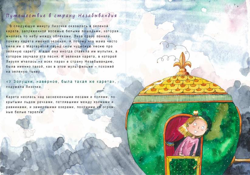 …В следующую минуту Лизочка оказалась в зеленой карете, запряженной восемью белыми лошадьми, которая мчалась по небу между облаками. Лиза сразу поняла, почему карета именно зеленая. А потому что мама часто пела им с Маргаритой перед сном чудесную песню про зеленую карету. А еще она иногда ставила им мультик, в котором звучала эта песня. И зеленая карета, в которой Лизуля мчалась на всех парах в страну Незабывандию, была именно такой, как в этом мультфильме – похожей на зеленую тыкву.