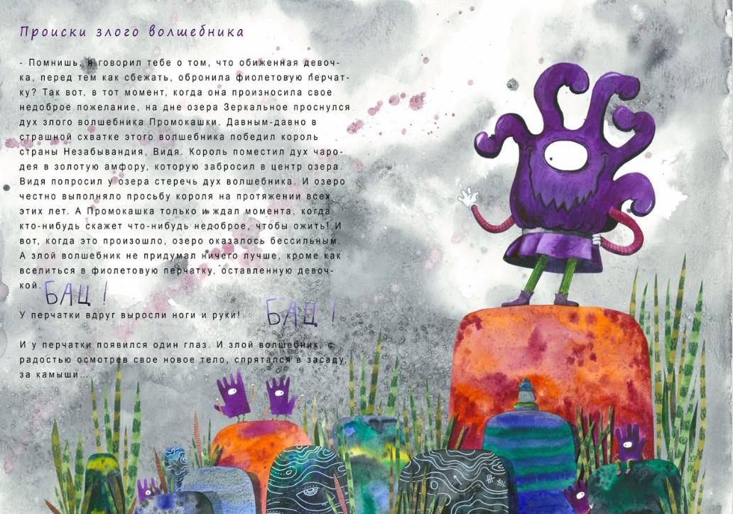– Помнишь, я говорил тебе о том, что обиженная девочка, перед тем как сбежать, обронила фиолетовую перчатку? Так вот, в тот момент, когда она произносила свое недоброе пожелание, на дне озера Зеркальное проснулся дух злого волшебника Промокашки. Давным-давно в страшной схватке этого волшебника победил король страны Незабывандия, Видя. Король поместил дух чародея в золотую амфору, которую забросил в центр озера. Видя попросил у озера стеречь дух волшебника. И озеро честно выполняло просьбу короля на протяжении всех этих лет. А Промокашка только и ждал момента, когда кто-нибудь скажет что-нибудь недоброе, чтобы ожить! И вот, когда это произошло, озеро оказалось бессильным. А злой волшебник не придумал ничего лучше, кроме как вселиться в фиолетовую перчатку, оставленную девочкой. Бац! У перчатки вдруг выросли ноги и руки! Бац! И у перчатки появился один глаз. И злой волшебник, с радостью осмотрев свое новое тело, спрятался в засаду, за камыши…Тем временем над озером Зеркальное, как и над всей страной Незабывандия, продолжался дождь. Он шел час, потом второй, затем – третий, и не думал заканчиваться. Люди, естественно, сразу же направились к озеру, для того чтобы пожелать возвращения солнечной погоды и прекращения дождя. Но не тут-то было! После того, как ожил Промокашка, озеро перестало выполнять желания людей. Стоило кому-то наклониться над водой, как он или она сразу же превращались в копии Промокашки – таких же фиолетовых человечков, похожих на перчатки, как и сам злой волшебник. При этом люди мгновенно забывали о своей прошлой жизни, о своих родных и близких. Как только житель Незабывандии превращался в двойника Промокашки, он сразу же бежал к своему господину – злому волшебнику, и прятался вместе с ним в засаде, за камышами…За несколько дней озеро успело превратить в прислужников Промокашки почти всех жителей Незабывандии.