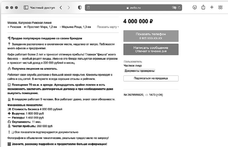 Бюджет. Бюджет на покупку готовой компании сопоставим с запуском бизнеса с нуля. Вернемся к нашему примеру с пиццерией, например, вот объявление о продаже пиццерии на «Авито»: