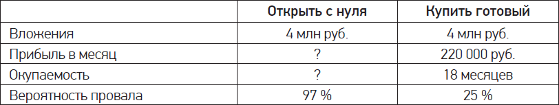 Вероятность успеха выше. И это легко объясняется: если бизнес дошел до продажи, значит, он уже научился генерировать выручку и справляться с проблемами. И если думать не как человек, который хочет открыть свой бизнес любой ценой, то сравнивать бизнес с нуля и готовый нужно так: