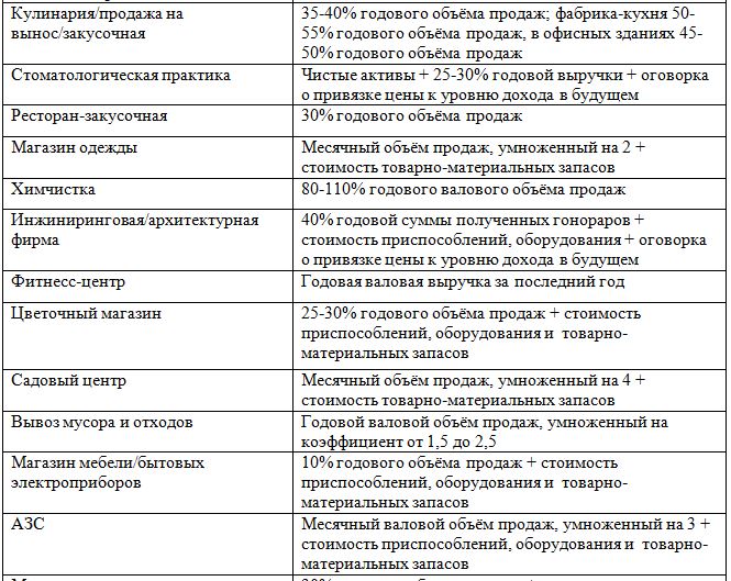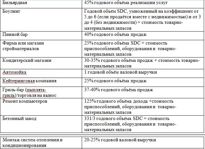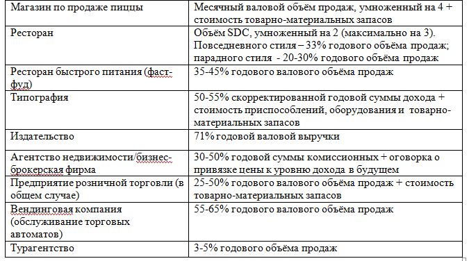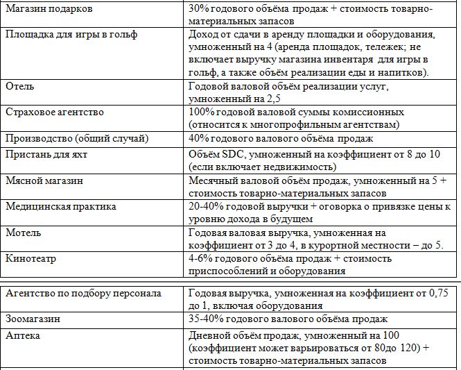 Многие из приведённых в таблице эмпирических правил основываются на нахождении величины, кратной величине так называемых дискреционных наличных средств продавца (SDC – Sellers Discretionary Cash). Этот термин представляет собой общий денежный поток компании, включая чистую прибыль, амортизацию (в большинстве случаев), заработную плату владельца и суммы из средств компании, которыми пользуется владелец: проценты; завышенные суммы заработка и льгот членов семьи; затраты на пользование служебными автомобилями в личных целях; завышенные командировочные и представительские расходы. Другими словами, это денежная сумма, остающаяся в распоряжении владельца после уплаты всех издержек, необходимых для функционирования бизнеса.