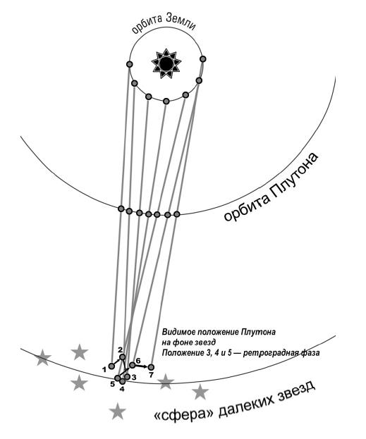 Рис. 1. Принципы возникновения ретроградного движения планет. При наблюдении с Земли планета движется «вспять» в периоды, когда Земля «обгоняет» эту планету (в случае Меркурия и Венеры они обгоняют Землю). Планеты, начиная от Марса и дальше, в это время находятся в фазе противостояния – планета близка к оппозиции с Солнцем (по астрологическим аспектам). Плутон находится в ретроградной фазе, когда угловое расстояние между ним и Солнцем при наблюдении с Земли > 100° по эклиптике.