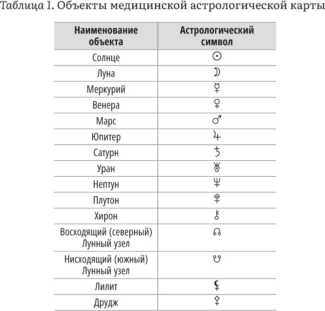 Поскольку медицинская астрология, как и другие виды астрологии, определяет состояние информационных полей космоса на основе расположения планет и некоторых других объектов Cолнечной системы, то именно эти объекты и являются главными фигурантами медицинской астрологической карты. Такими объектами выступают светила (Солнце и Луна), планеты Солнечной системы, некоторые планетоиды (Плутон, Хирон), а также объекты непланетарного типа, но имеющие характерное астрономическое и эзотерическое значение (лунные узлы, Лилит) (см. таблицу 1).