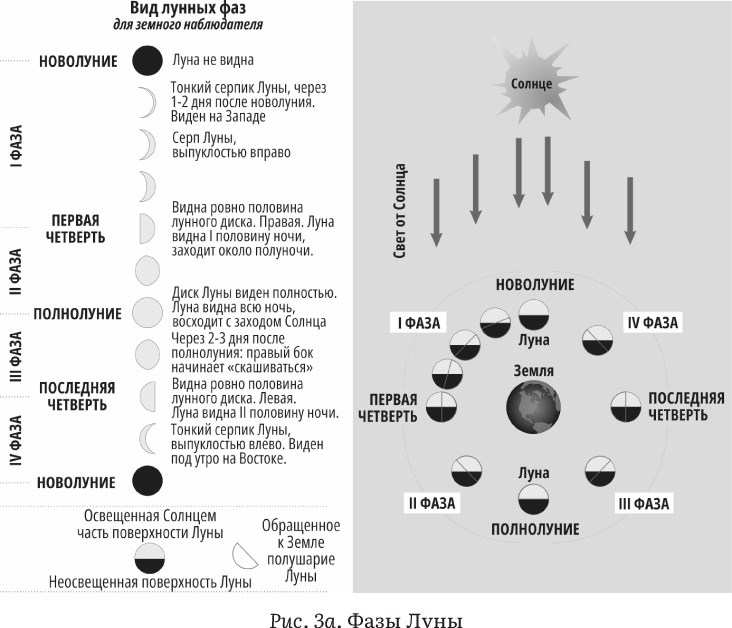 Луна. Естественный спутник Земли. Единственный физический объект, используемый в астрологии, который движется непосредственно вокруг Земли. Луна – второй по величине объект на нашем небе. Характерной особенностью Луны являются ее фазы – отношение освещенной Солнцем поверхности ее диска к неосвещенной части (см. рис. 3а). Цикл смены лунных фаз длится 29,5306 дня, а один оборот по небу Луна совершает за 27,3212 дня.