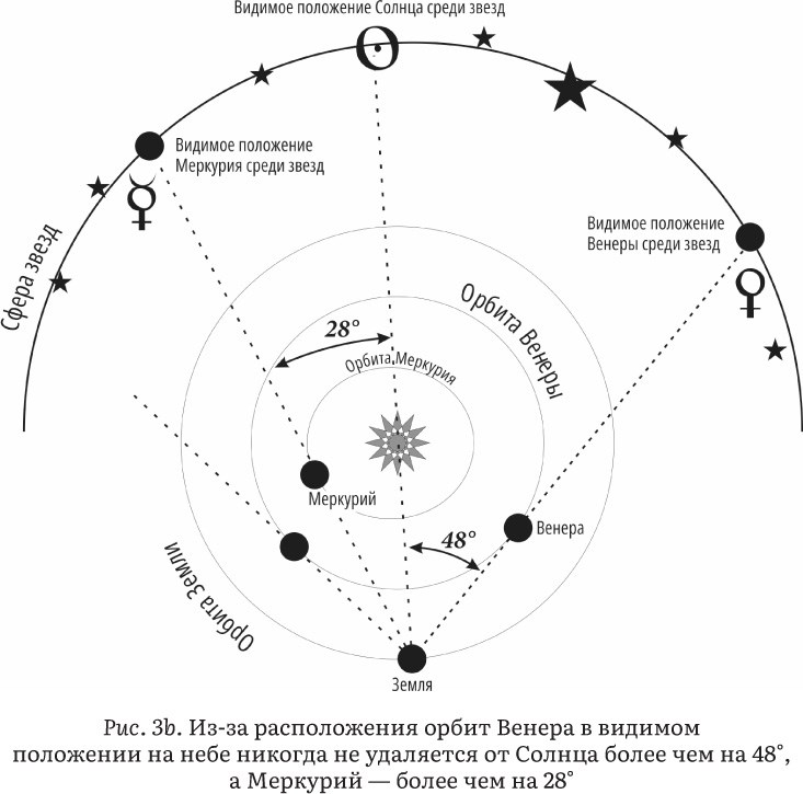 Меркурий и Венера. Являются так называемыми «внутренними» планетами, потому что их орбиты расположены ближе к Солнцу, чем орбита Земли. То есть они находятся как бы внутри орбиты Земли (см. рис. 3b).