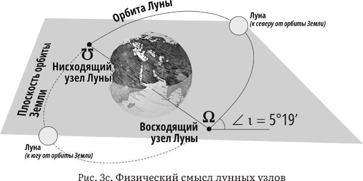 Лунные узлы. Это не планеты! Это не физические объекты, не небесные тела, их нельзя увидеть на небе. Тем не менее это точки, имеющие строго определенный астрономический смысл, – это точки пересечения орбиты Луны с орбитой Земли (эклиптикой) (см. рис. 3с). Лунных узлов два – восходящий, или северный, и нисходящий, или южный. В астрологии лунные узлы являются показателями кармы.