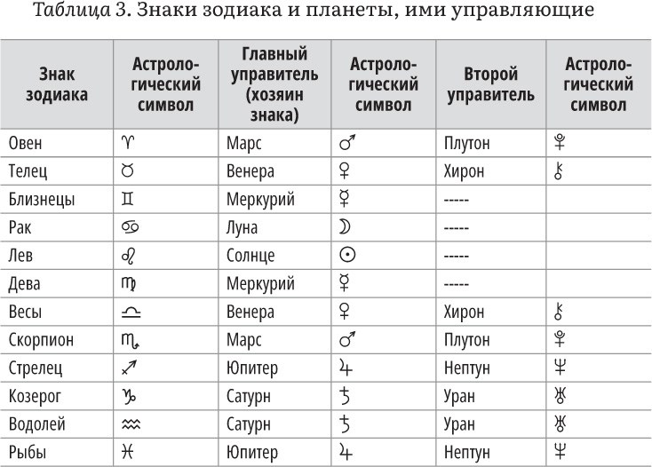 Знаки зодиака являются небесными домами для планет, и, как каждый дом имеет своего хозяина, так и каждый знак зодиака имеет планету – своего хозяина. Одна планета, за исключением Солнца и Луны, управляет двумя знаками зодиака (см. таблицу 3). Находясь в знаке, где хозяйничает определенная планета, та планета, которая зашла в этот знак, считается «гостьей». Хозяин знака оказывает влияние на все планеты, находящиеся в его знаке (доме). Планета – хозяин знака является олицетворением и выражением принципов данного знака. В астрологии планета – хозяин знака также называется планетой – управителем знака.