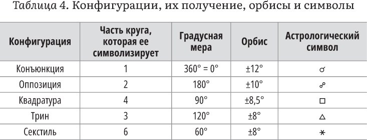 Астрономически конфигурации представляют собой угол, который получается делением целого круга на некое число. Каждая конфигурация располагает таким понятием, как орбис – это некий диапазон по обе стороны от точного значения конфигурации, в рамках которого она является действенной, то есть ощущается.