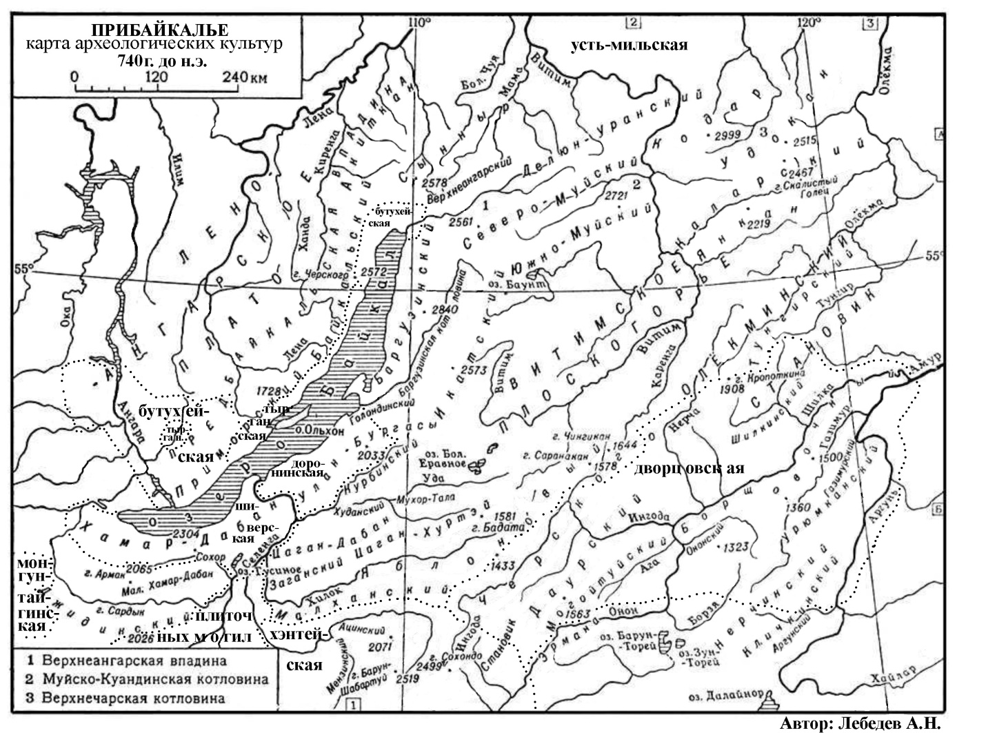Рис.1. Карта археологических культур Прибайкалья 740 г. до н.э.