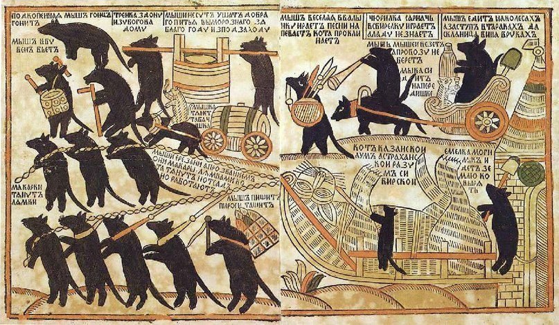 №42 (С). В произведениях А.С Пушкина висевшие на стенах лубочные картины обычно являются спойлерами отдельных сюжетных ходов. Не заглядывая дальше в книгу, пофантазируйте, что может произойти в произведении с героями? Обратите внимание на имя мыши, которая идет коту могилку копать.