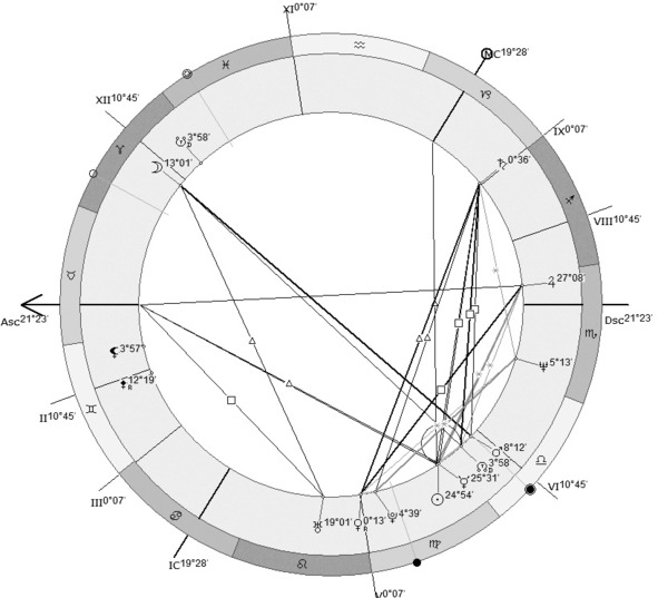В заключении обратим внимание на его Х дом. Его куспид находится в Скорпионе. Первый управитель, Марс находится на Асценденте – успех придёт в результате собственных активных усилий, в результате собственной деятельности, работы на себя. Второй, Плутон, в IX доме – успеху будет сопутствовать обучение, получение знаний, обретение философии успеха (философии ведения бизнеса). При этом эссенциальная природа Плутона – перерождение. А в данной Карте речь идёт о перерождении взглядов на бизнес после обучения, на активное применение нового [для себя] подхода к организации и развитию бизнеса. Это кризис первоначального, несостоятельного подхода, и поиск новых путей, обучение, обретение знаний, а затем новый шанс. То есть Плутон, управитель Х дома, в IX прямо свидетельствует об успехе в делах после прохождения соответствующего обучения. В общем, учиться, учиться и ещё раз учиться!