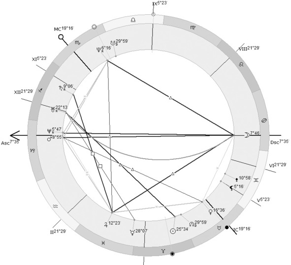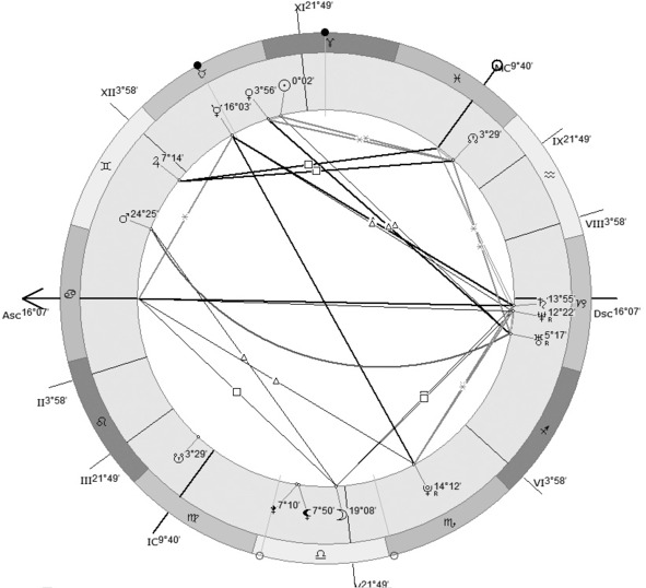 Дом местоположения Марса (как злой планеты) указывает на источник проблем, на то, где человек допускает ошибки, и что он делает не так. Дом местоположения Луны соответственно скажет, на чём всё это отразиться. Марс расположен в I доме. Значит всё дело в поведении самого человека, в его вспыльчивости, немотивированных эмоциях и агрессии, индивидуализме. Луна находится на Десценденте, и управляет VII домом. Символика Луны – непостоянство и неустойчивость, здесь она отражается на партнёрских отношениях (VII доме). Даже сама по себе, Луна, детерминированная в VII доме, предвещает неустойчивость и непостоянство в партнёрских отношениях, на колебания, эмоциональную зависимость от партнёра. А когда Луна из VII дома ещё и в оппозиции с Марсом – то это прямой знак того, что человек будет стремиться разрушить любой вид возникших партнёрских отношений. Марс в I доме подчёркивает его индивидуализм, ему трудно находится с кем-либо рядом даже не очень продолжительное время. Он не может допустить ни в личной жизни, ни в работе рядом с собой другого человека. Он устаёт от партнёрства, поэтому внутренне его не принимает. Необходимость считаться с чужим мнением сразу начинает раздражать его. Ему не нравится, когда ему советуют, покушаются на его свободу, его автономию. Он жаждет всецело быть предоставленным себе сам. Ещё больше не нравиться, когда делают не так, как он хочет, не так, как он сказал. А необходимость подчиняться партнёрским обязательствам вызывает у него протест.