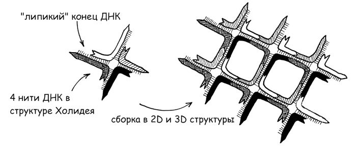Физиологической основой формирования воспалительных структур, основанных на ДНК – так называемых внеклеточных нитей нейтрофилов (NET, neutrophil extracellular traps), является процесс нетоза нейтрофилов. Нейтрофилы – наиболее распространенная разновидность лейкоцитов, рядовые солдаты острой воспалительной реакции организма. Сам нетоз можно считать разновидностью апоптоза – запрограммированной клеточной смерти, а нейтрофилы – клетками-камикадзе, предназначенными умереть, отдав самое святое – свою ДНК – в качестве кирпичей на строительство оборонительных рубежей всего организма (собственно смерть нейтрофила при этом не является совсем обязательной, а сам нетоз может создавать при определенных условиях и существенные проблемы для всего организма (Papayannopoulos V., 2018)). Важность этого защитного механизма, имеющего, вероятно, очень глубокие эволюционные корни – своего рода возврат к первичным основаниям жизни, своеобразное повторение филогенеза в патогенезе, подтверждается тем фактом, что наличие ферментов экзонуклеаз, способных разрушать NET структуры, служит существенным фактором вирулентности бактерий (Sharma P. et al., 2019). Напротив, и сами бактерии способны формировать из ДНК несущую решетку своего внеклеточного матрикса – основу бактериальных биопленок, своеобразный защитный чехол бактериального сообщества. Причем ключевые единицы такой ДНК-решетки аналогичны так называемым структурам Холидея – крестообразным формированиям двухцепочечной ДНК (рис. 7). И совершенно неслучайно именно ДНК-структуры, в том числе сформированные с использованием структур Холидея, применяются в качестве строительных блоков для ряда нанотехнологических материалов. Тем более что ДНК в качестве структурного материала обладает рядом уникальных свойств: например, высокоточной самосборкой и самоукладкой в полимолекулярные комплексы (Rothemund P. W. K., 2006), способностью проводить ток (в том числе фотохимического происхождения), что может быть весьма существенным фактором для участия в энергопроизводящих ячеистых структурах (см. рис. 2-6). Причем менее организованная, но более компактная А-форма (конформационно близкая к двухцепочечной РНК и ДНК-РНК гибридам) делает это на порядок более эффективно, чем более известная В-форма – правозакрученная спираль (Artes J. M. et al., 2015).