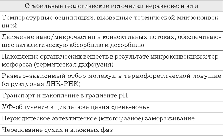 Важность разделительных структур в эволюции нуклеиновых кислот акцентируется в работах немецкого исследователя Кристофа Маста (Christof Mast et al., 2010; 2013). Мастом сформулирована теория термодинамической ловушки. Она показывает, что наличие термохимических градиентов создает дополнительные состояния неравновесности, стимулирующие в частных случаях полимеризацию, репликацию и концентрирование ДНК и возникновение дарвинского отбора в более общих случаях (табл. 1). Помимо термического градиента, вызванного геологическими условиями (разница температур гидротермального источника и внешней (например, морской воды), дополнительный, хотя и сравнительно микроскопический, но в некоторых ситуациях решающий вклад мог вносить и химический градиент протонов (электронов) и/или натрия, способный, в принципе, также создавать температурный градиент. Этот искусственно возникающий градиент, в свою очередь, несмотря на свою кажущуюся незначительность, мог способствовать впоследствии независимости протобиологических структур от геологических. По некоторым расчетам, даже незначительного температурного градиента в отдельных случаях может оказаться достаточно, например для обеспечения простого деления протоклеток: перемещение более «горячих» молекул двуслойной наружной мембраны наружу, движимое простыми физическими механизмами, увеличивает среднюю кривизну и усиливает любое локальное сжатие протоклетки вплоть до полного разделения на две (Romain Attal and Laurent Schwartz, 2021).