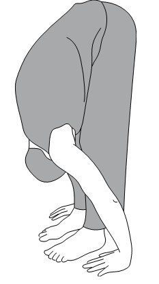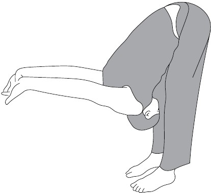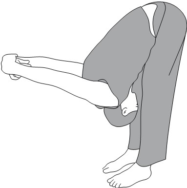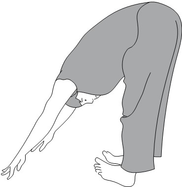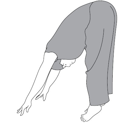 Ставим ноги на ширине плеч, руки складываем «полочкой». Сохраняя спину прямой, наклоняемся вперед. В какой-то момент наши руки оказываются над головой и свешиваются. Важно, чтобы шея была расслаблена, для этого нужно поболтать головой из стороны в сторону. Если в этом положении вы испытываете выраженный дискомфорт, то можно немного согнуть ноги в коленях и положить живот на бедра. Однако лучше держать ноги прямыми. Постепенно вы расслабитесь, ваш корпус будет наклоняться все ниже и ниже. Рекомендуем делать упражнение, стоя спиной к стене, сантиметрах в 15 от нее. Если ягодицы начнут упираться в стену, вы поймете, что слишком заваливаетесь назад. Такого быть не должно.