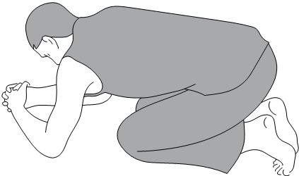 Наклонитесь вперед так, чтобы живот достал до бедер, ноги в коленях согните. Обхватите себя за ноги, а затем пробуйте, не отрывая живот от бедер, выпрямить ноги в коленях.